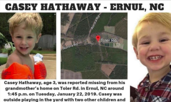 Các nhân viên cứu hộ cho biết cậu bé 3 tuổi Casey Hathaway đã được tìm thấy hôm thứ Năm (24/1) với tình trạng toàn thân lạnh toát, mắc kẹt trong một bụi cây nhưng vẫn an toàn, cơ thể không có vết thương. Trước đó 2 ngày, thứ Ba (22/1), cậu bé Hathaway đã bị mất tích trong điều kiện tồi tệ đến mức công việc cứu hộ, tìm kiếm phải bị trì hoãn.